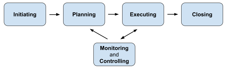 A project life cycle typically consists of 5 phases, starting at Initiating and ending at Closing. Phases are not necessarily sequential in time. Executing and Monitoring & Controlling take place at the same time. For some projects also Planning can take place at the same time as Executing. In a cyclic type of project, phases are planned more agile, meaning that they can follow external demand; during phase 1 the next phase 2 is planned, etc.