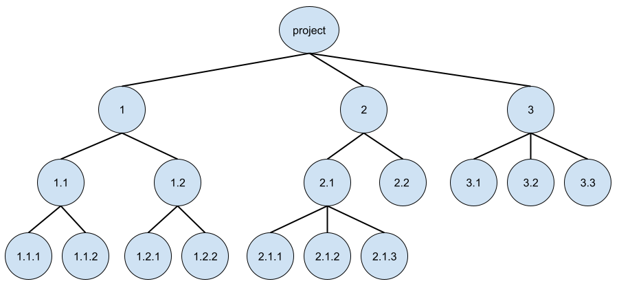 In order to understand a node, you need to follow the entire path from root to node. The number of nodes in the path is the level of the node. With a WBS you make a breakdown from a complex deliverable to well-defined tasks. This systematic approach reduces the chance of overlooking relevant work.