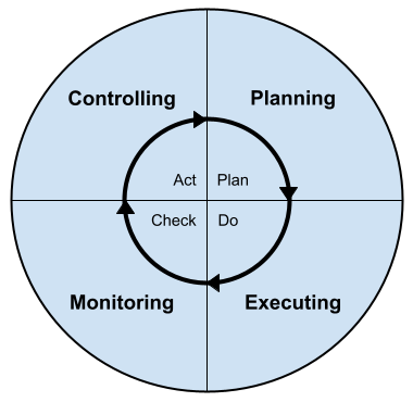 A dynamic view of the project phases is the Deming circle, where the Plan-Do-Check-Act cycle is presented as a framework for continuous improvement. This shows how the execution is continuously monitored against the planned objectives. If necessary, the objectives or plan are adjusted.