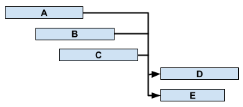 Activities D and E can only start when A, B and C are ready. Whether an activity is ready is made visible with a line in the centre of the Gantt bar. When the line has the same length as the bar, it is ready.